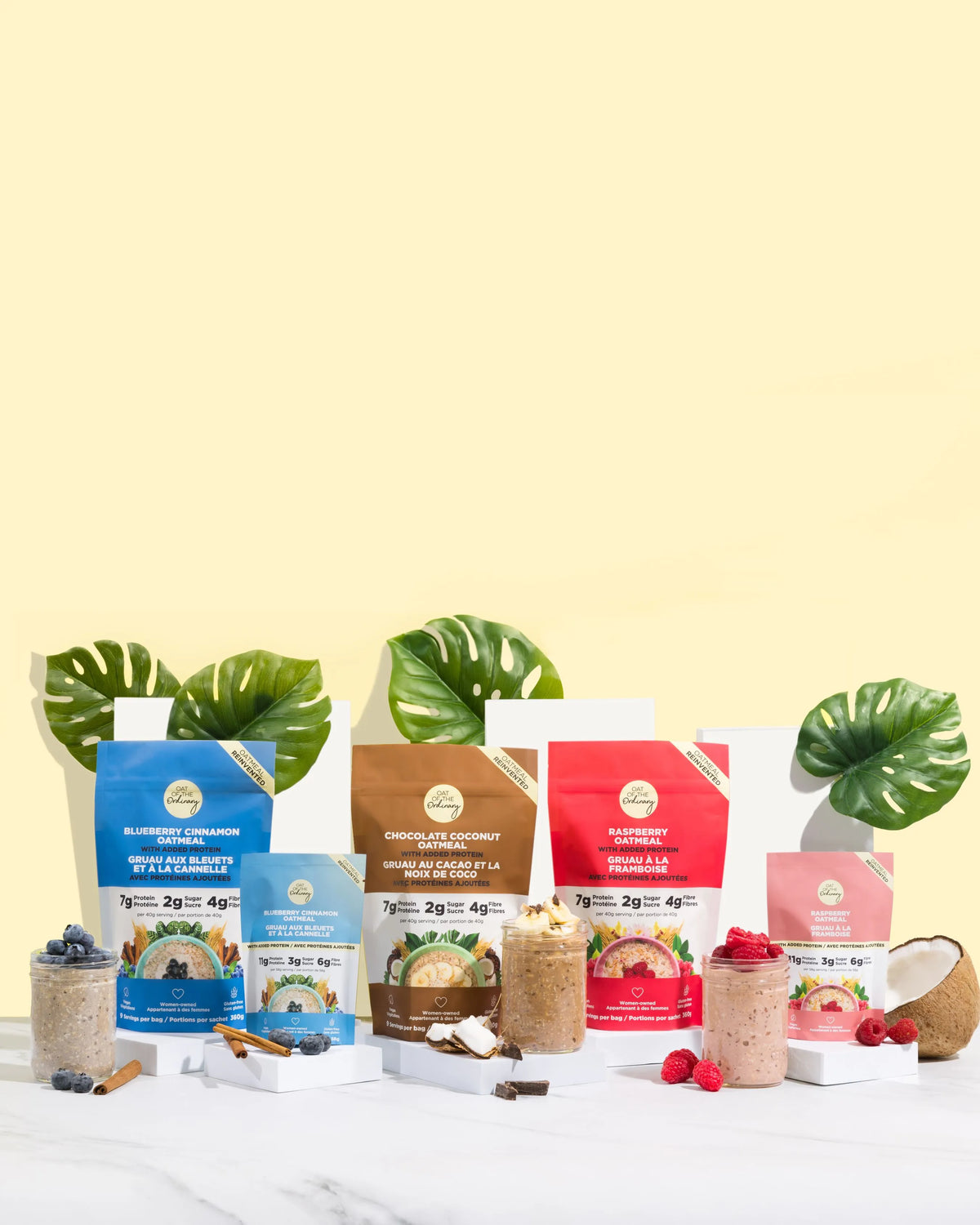 Our oatmeal comes in three delicious flavours. Blueberry Cinnamon, Chocolate Coconut and Raspberry.